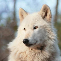 Lobo de pelaje blanco y ojos color naranja. Con un detalle de un enorme corazón negro en su pecho, mide cerca de 75cm de altura y sus colmillos son casi tan afilados como los de un alfa.